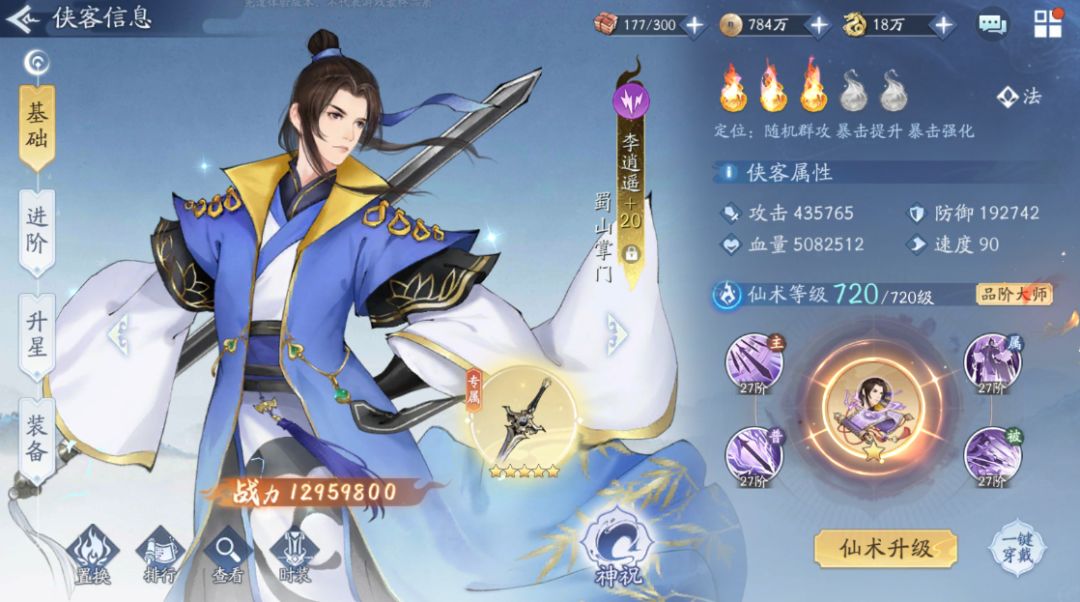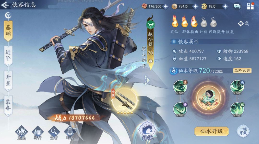 4号位飞蓬——天罡战气独步武林,锁定自身气血,双重血祭效果震撼,被动赋予剑气威能,怒招施展时,无视对方高达30%的防御,实现震撼全场的输出,战力指数SS