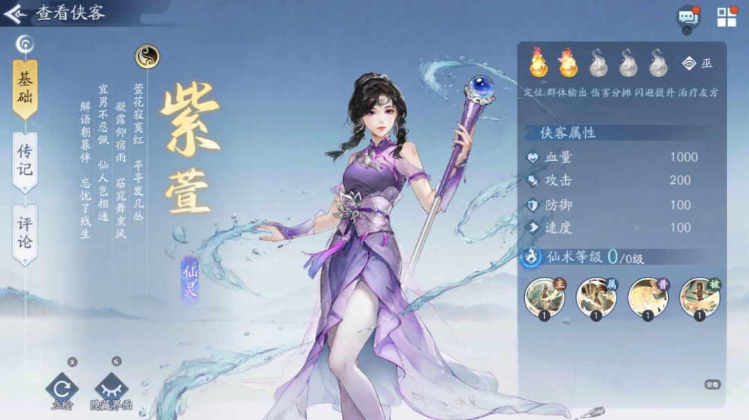 6号位紫萱——怒招天幕,在遭受攻击时,伤害将均摊至每一位侠客,同时,若在天幕期间有侠客不幸阵亡,将激发其他侠客攻击力得到显著提升。一旦战斗结束,所有在战斗中逝去的侠客都将重获新生,再次并肩作战,战力指数S,恶心指数SSS