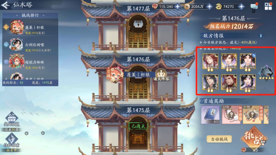 1476这关与1466那关是近乎一样的阵容,然而,随着时间的推移,队伍的整体实力得到了显著提升,配合越今朝和剑圣这两位实力派角色,能够有效地发挥出强大的伤害输出能力。因此,目前面临的威胁和压力相较于之前已经减轻了许多。不过,关于这个仙术塔的更新和发展,感觉官方已经逐渐放弃了,目前也没有太多相关的信息提及。仙术塔的玩家们都希望能看到新的层次的加入,或者是对奖励进行进一步的丰富,以提升我们的游戏体验。
