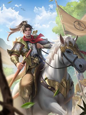 让我们再深入挖掘一下这张sp孙策原画背后的细节,那面带有“袁”字的旗帜显示了这幅原画描绘的是孙策在袁术手下时期的经历。孙策身着标志性的小霸王传统服饰,盔甲上黄色与绿色交织,他手持长剑,目光坚定,仿佛时刻准备好在战场上冲锋陷阵,展现出他那不屈不挠而又激昂的精神气。然而,这身华丽的服饰与装备,却也暗示了孙策在袁术手下的处境。游戏里群雄的代表色黄色表明他身处在袁术麾下,但那盔甲泛出的绿光暗示着孙策心中始终有着自己的志向和追求。就像这身铠甲一样,孙策虽然在表面上遵从袁术的命令,但他的内心却如同这身服饰折射出的绿芒,充满了对自由和独立的渴望。