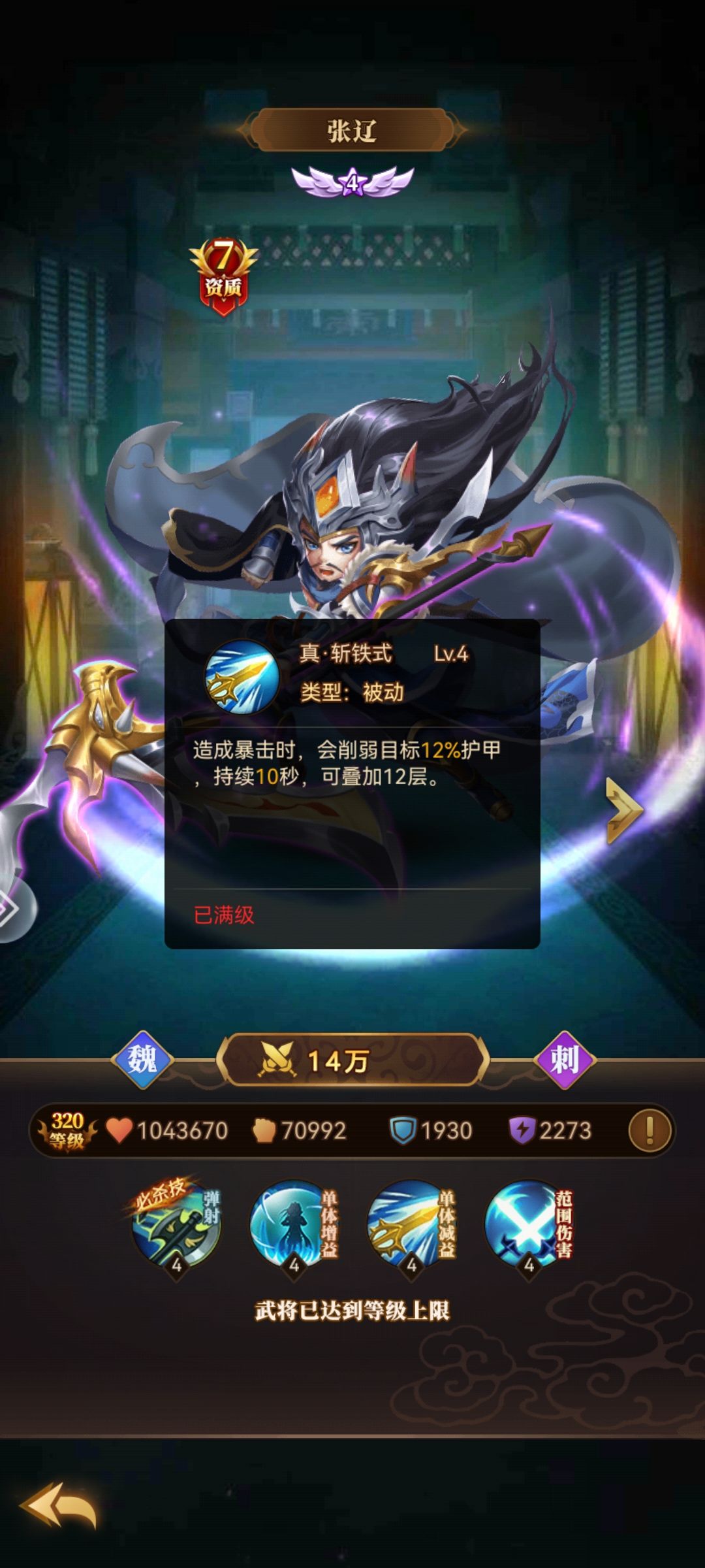 培养建议:优先提升张辽的暴击率、攻击力和回能属性,以保证其技能的持续输出能力。同时,注意保持其生存能力以延长战斗时间。