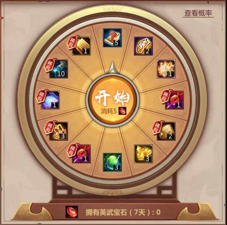 【英武宝库】其实是一个抽奖转盘,通过挑战地图免费得到的【英武宝石】,就是开启这个转盘的钥匙啦。
