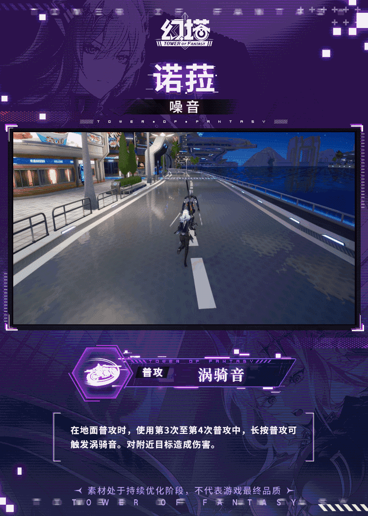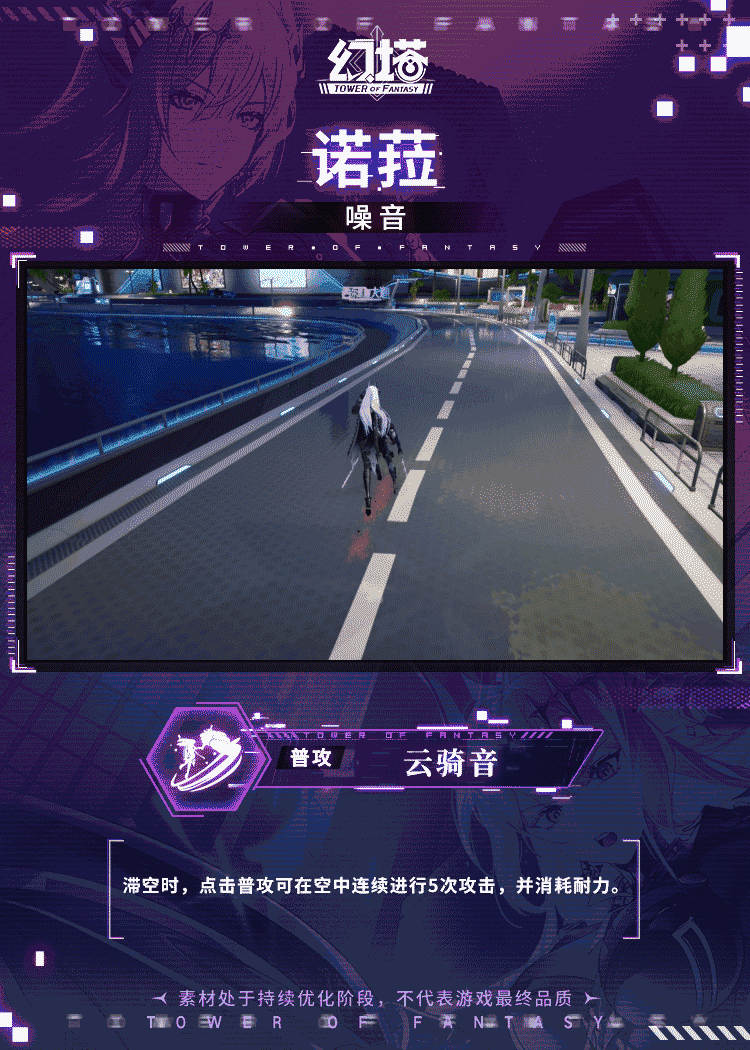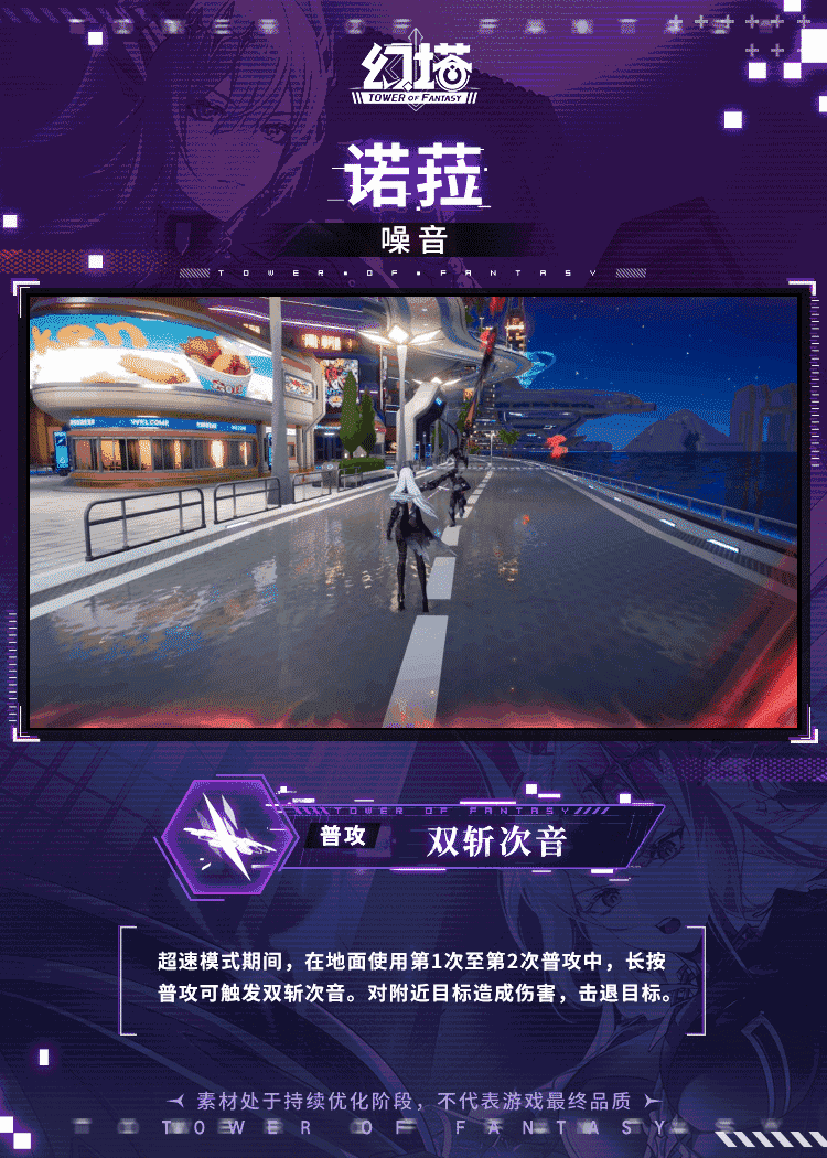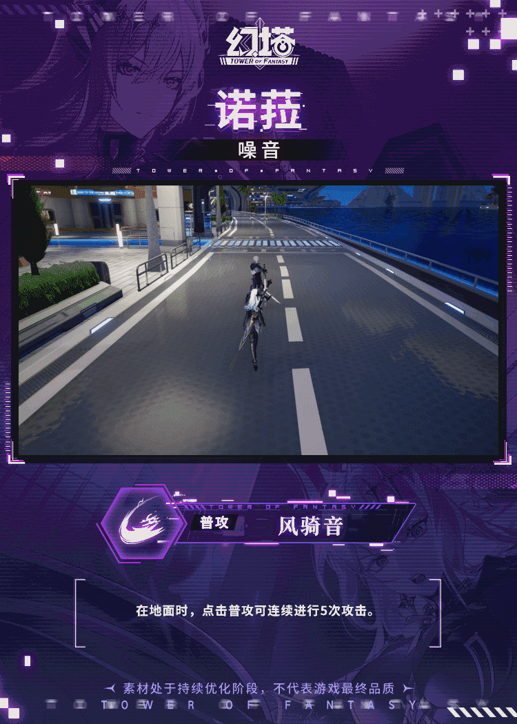在地面时,点击普攻可连续进行5次攻击;滞空时,点击普攻可在空中连续进行5次攻击,并消耗耐力。超速模式期间,在地面使用第1次至第2次普攻中,长按普攻可触发双斩次音;触发双斩次音后,继续长按普攻可触发连斩次音,对附近目标造成伤害。在地面普攻时,使用第3次至第4次普攻中,长按普攻可触发涡骑音。滞空时长按普攻,可触发行骑音。