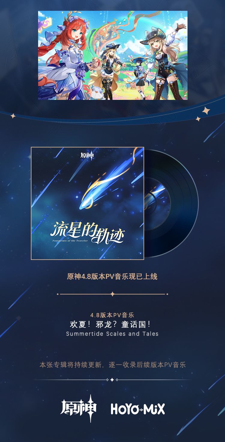 亲爱的旅行者,原神4.8版本PV音乐《欢夏!邪龙?童话国!Summertide Scales and Tales》现已更新加入专辑《流星的轨迹 Footprints of the Traveler》中。后续版本PV曲目将随版本PV同步更新。