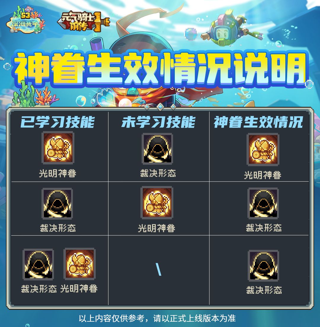 1、若小骑士只学习了光明使者的“光明神眷”,没有学习裁决者的“裁决形态”,则神眷效果为“光明神眷”,“光明庇护”生效,“裁决形态”不生效;