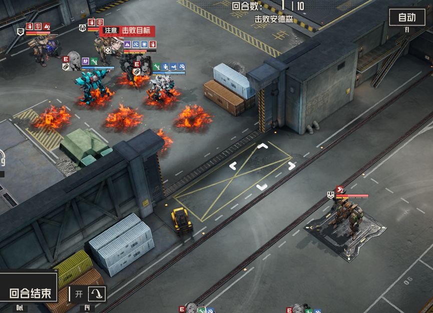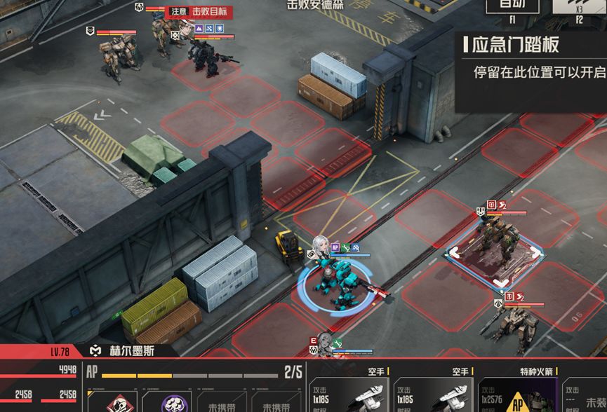 本关地图被分割为多个房间,中间存在高墙阻隔,飞行背包和战术武器都无法越过阻碍,唯有通关占据应急门踏板,方能通行。而本关的目标则是消灭安德森,其最终会逃离至上方房间,故我方有两种方法,一种方法是通过层次关卡追逐其至终点,将其消灭;另一种方法是在其未逃离过远时,由高机动性机师将其斩首。