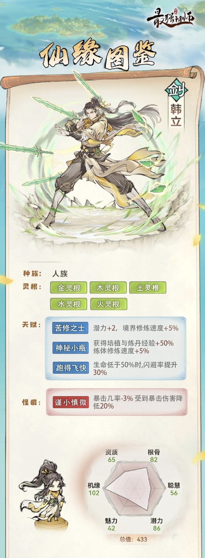 ①:木灵根变异风灵根,有10%的速度加成与8%的闪避加成。10%的速度能让韩立优先对手主C出手,8%的闪避配合自身跑的飞快天赋能进一步提升自身的生存能力。