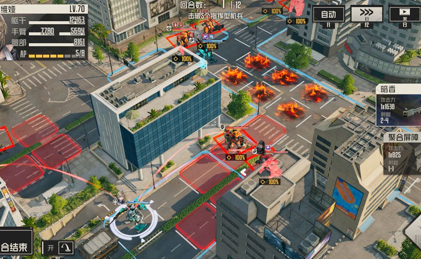 第二回合,敌方继续投放扩散火箭,离开火箭范围后,西尔维亚和白月将中间指挥型机兵消灭