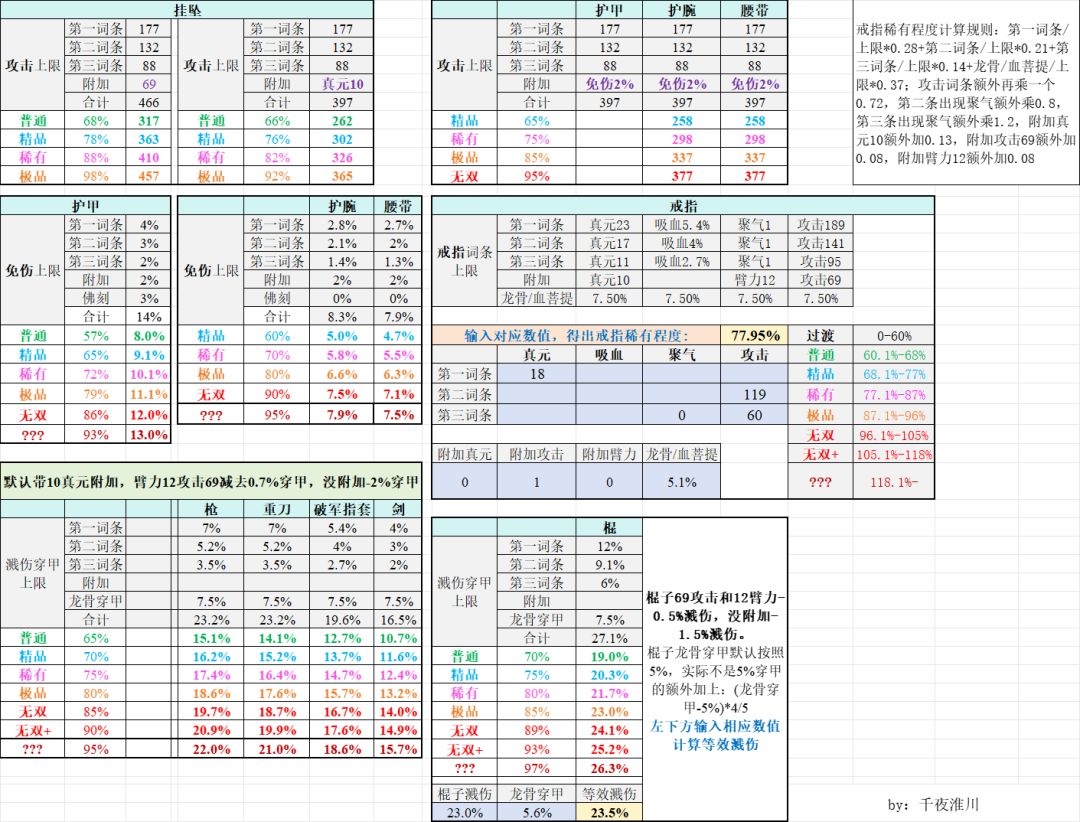 什么才算好装备,这张图为你展示,普通和精品是大部分玩家精炼可以达到的水平,稀有装备是每人只有一两件两三年的水平,极品是每个区只有几件的水平,无双是几个区有一两件的水平,???基本上是仅靠精炼达不到的数值,要一打造出来就是极高的数值,全游戏不开的基本没人有