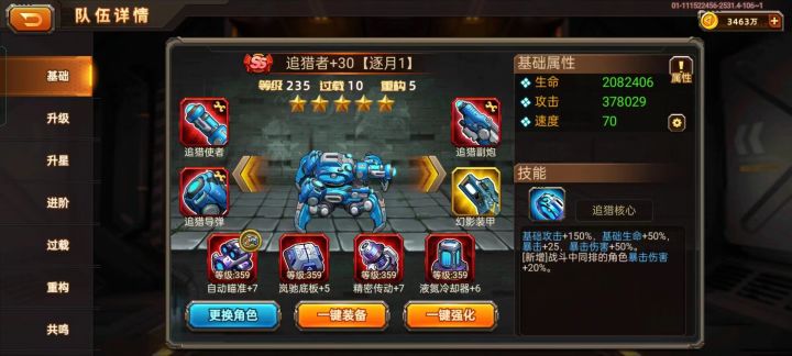 追猎:5星,重构5,主炮解限20,副炮解限5,共鸣伤害增加35,伤害650865612