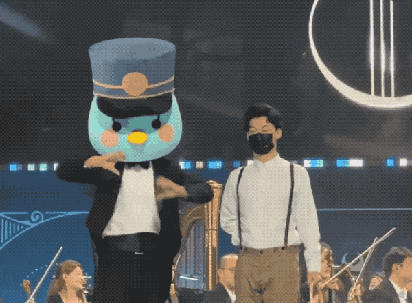 作为小彩蛋,音乐会还专门安排了蓝星提着一篮子苹果(游戏中“体力道具”的具象表达)上台,给指挥和乐手送去,希望他们在酣畅淋漓的演奏后“补充一些体力”。同时,蓝星还用诸如四处挥手/比个心/掏掏兜等的肢体动作回应了台下玩家的“呼声”,让现场氛围愈发热烈。