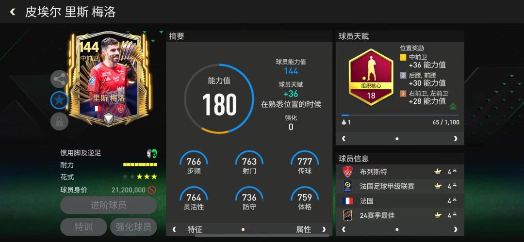 在游戏中,本张24赛季最佳梅洛为中前卫位置,配备组织核心天赋,对他的短传、长传、视野、盘带、反应五项数据都有提升。实战中,梅洛的主要定位是负责中场组织和拦截,相比传统的组织中前卫,梅洛不仅组织能力强,还有着积极的跑动和出色的拦截能力,非常全能。除了出色的传导球能力外,梅洛的1V1铲球拦截成功率也非常高,多项优点结合来看,这张梅洛是名副其实的中场万金油,非常适合玩家上手。