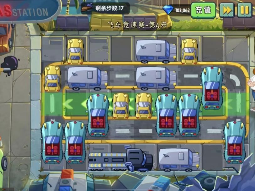 玩法:再规定的步数内,按照车头的朝向可进行移动,将中间的道路空出来即可。