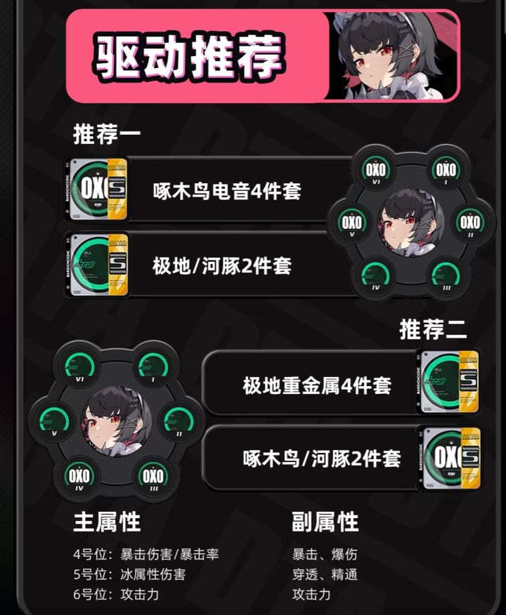 1. **驱动推荐**:极地重金属4、啄木鸟电音2。由于艾莲乔的强度超标,即使是逆版本的冰属性也可以上场输出,因此驱动选择4极地来获取冰属性伤害以及普攻伤害加成。