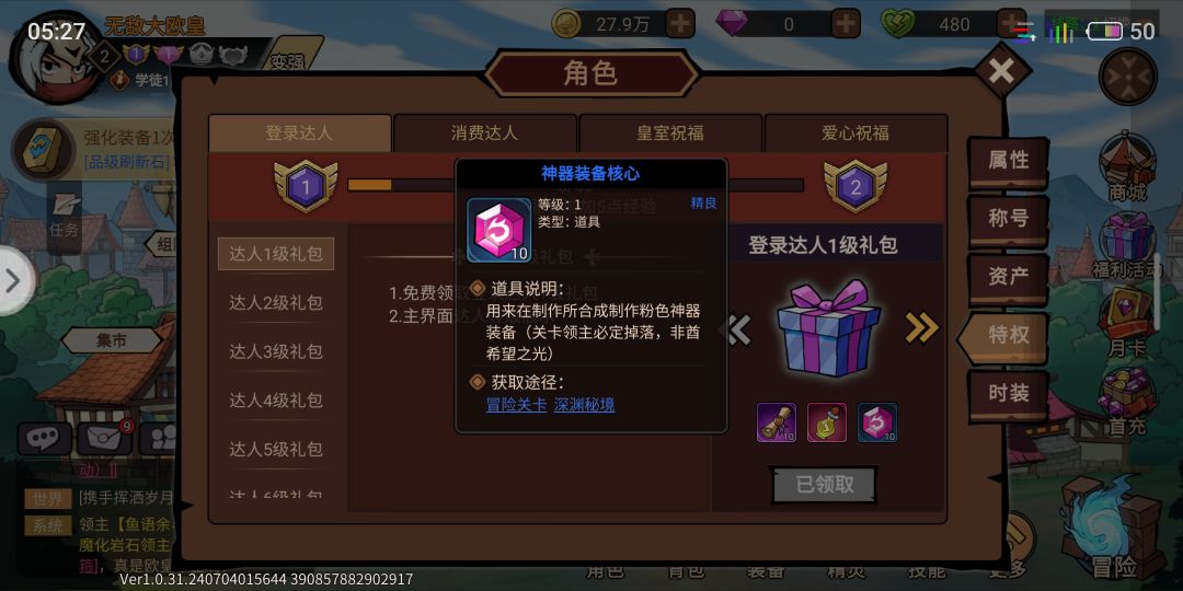 神器核心可以通过分解粉装扫荡关卡与深渊获得