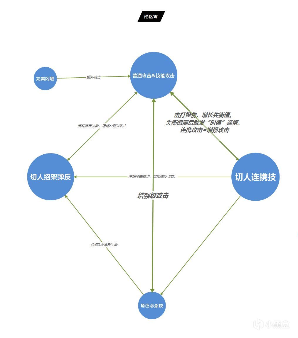 在5个圆中,切人绑定平常动作游戏的招架弹反,普通&技能攻击是为了叠切人连携技的失衡值,两大切换逻辑,把控了战斗系统中的核心防御以及核心输出动作,可以说这个动作系统是为了切换角色而构建的。如果不切人,就会缺乏防御动作以及核心连招,无法让动作系统达成循环。玩家仅能做,普通&技能+非常漫长的必杀技,而完美闪避更是单独键位,仅能跟普攻联动。