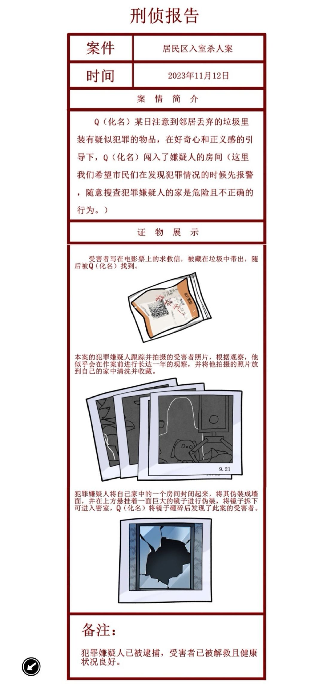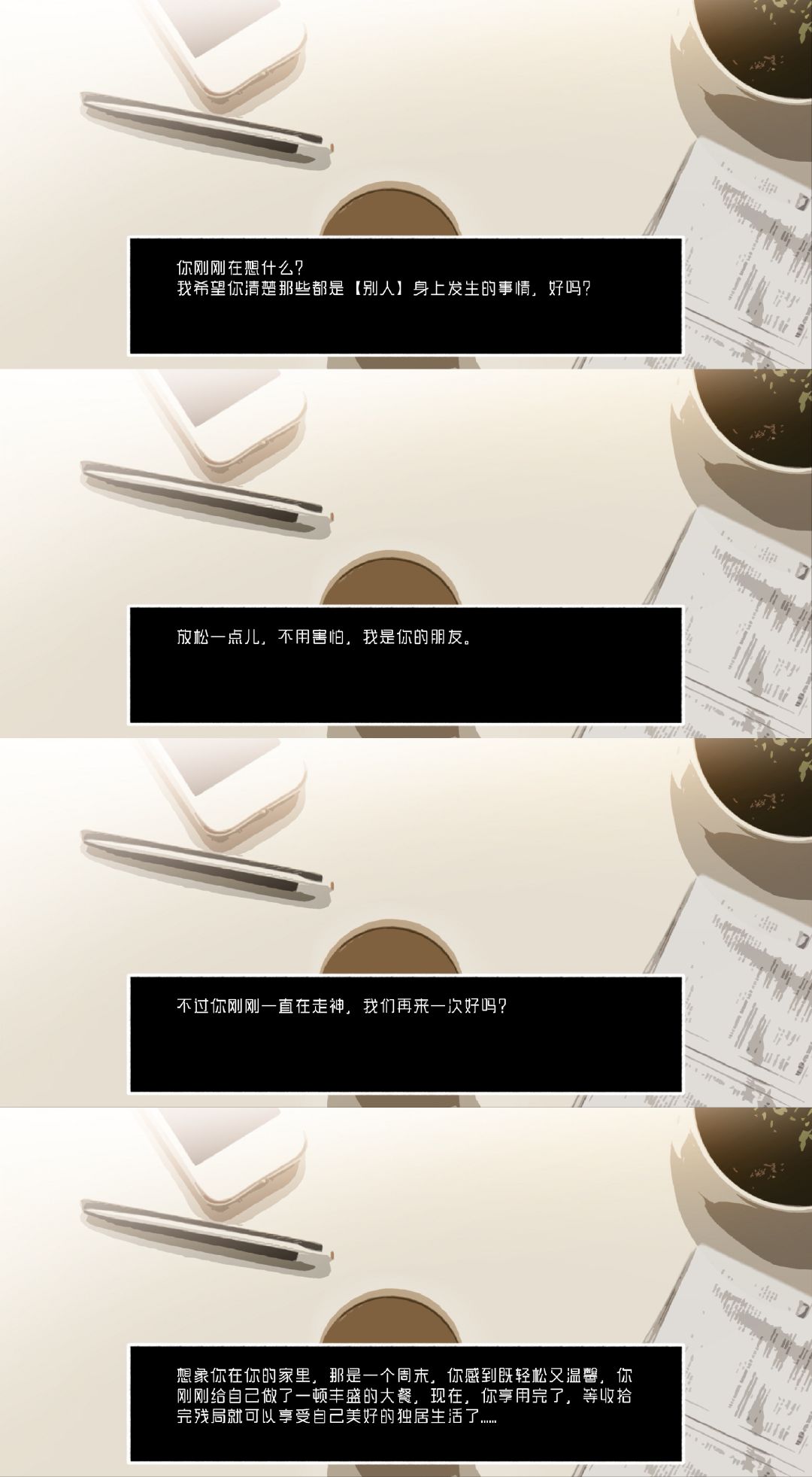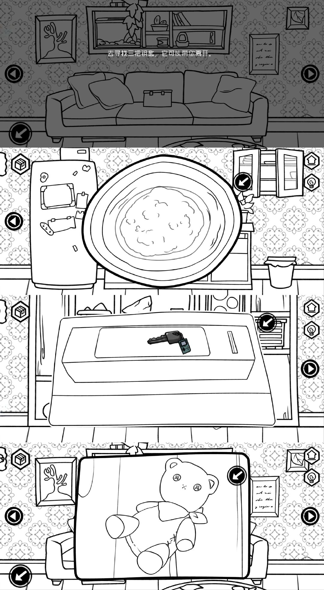 看着其貌不扬的游戏,没想到这么神秘深奥;以为是小清新解谜游戏,没想到是悬疑恐怖游戏。游戏总共有三条线、三个结局,第一条线是打开邻居家门,打破镜子,解救女性受害者;第二条线是进到领居家,直奔地窖,打开相机,察觉真相;第三条线是在自己家,往沙发上的盒子输入AMY-QIU,进入白色空间,找到三把钥匙开门。三条线单独进行,不能交叉,不能后退,进入地窖就出不去,进入白色空间就不能返回,所以在进入一定结局之前一定要慎重选择。