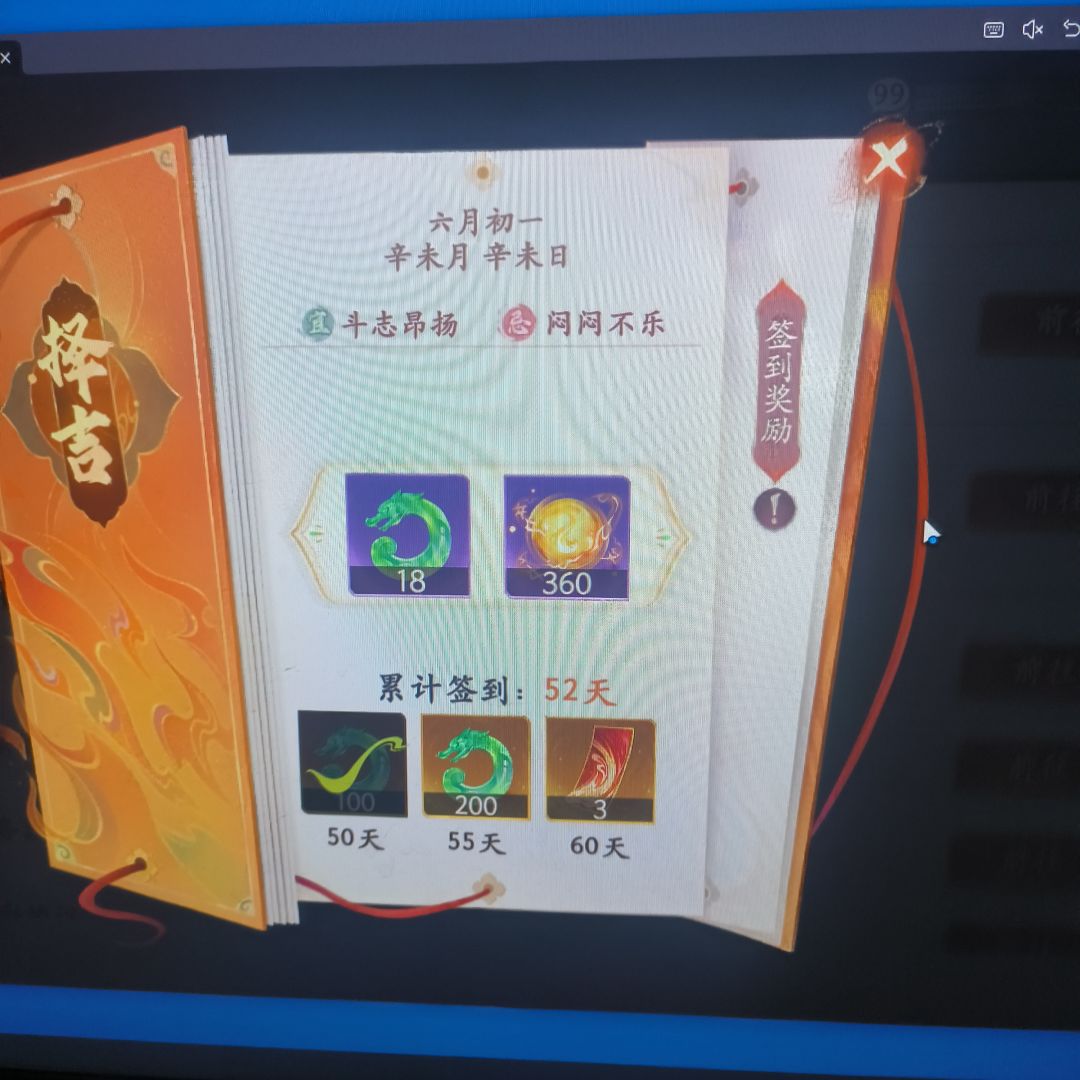 0氪小嫦娥镇楼,第1次玩一个游戏主线,打通关,看了一下签到总共52天,我玩游戏,还是比较看眼缘的,有些游戏死活玩不进去,或者,刚开始玩进去了,后面渐渐的就无聊了,能坚持玩一个月以上的游戏,少之又少,尤其最近两年,这算是我玩的最久的一个了