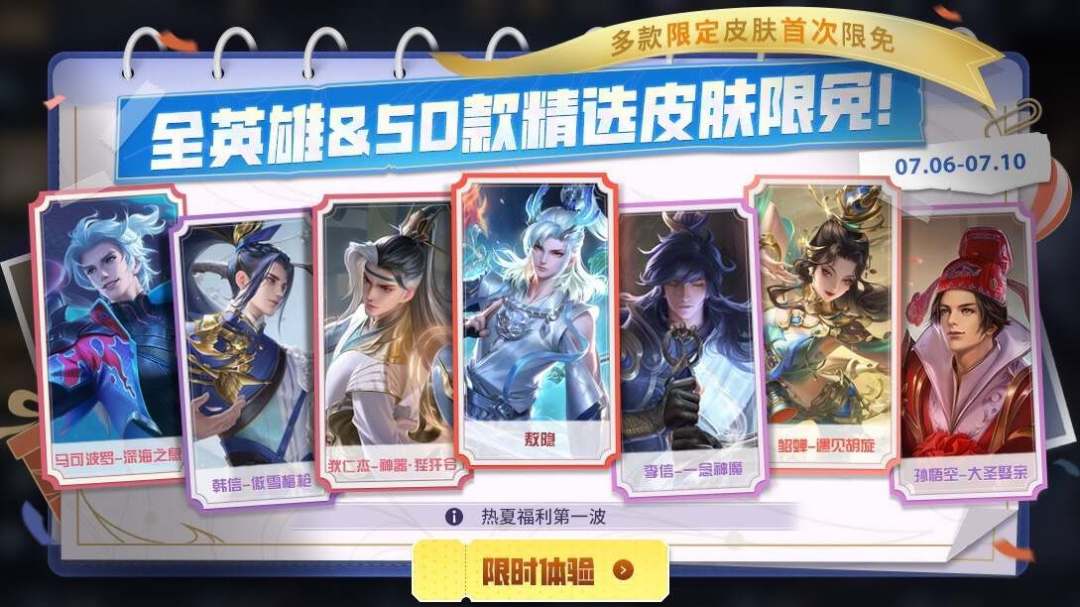 7月6号孙悟空这个英雄的出场率暴增,尤其是在排位赛中,已经成为了出场率最高的打野英雄。之所以他的出场率突然暴涨,也是因为最近官方开启的一个皮肤体验活动,在7月6号到7月10号这段时间,全英雄外加50款精选皮肤可以让玩家免费体验。在这50款皮肤中,就包含猴子的部分皮肤,其中有大圣娶亲、至尊宝、零号机甲皮肤等。