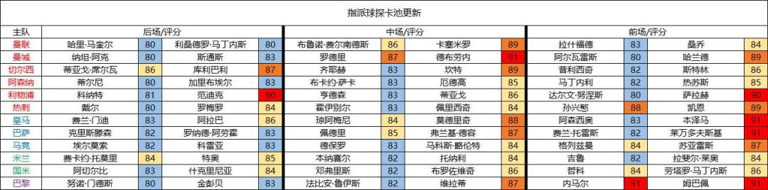 切尔西:89法国坎特、85意大利若日尼奥、86英格兰斯特林、84德国哈弗茨、84英格兰芒特、84英格兰里斯詹姆斯、86巴西蒂亚戈席尔瓦选择这两个主队可以帮助新人玩家更快积攒主流国家84+球员以便更快形成优势帮助阵容成型,指派抽奖的顺序为前场、巅峰、中场、巅峰、后场、巅峰的顺序,玩家可以根据自己的需求来抽取心仪的up球员,下附up抽取: