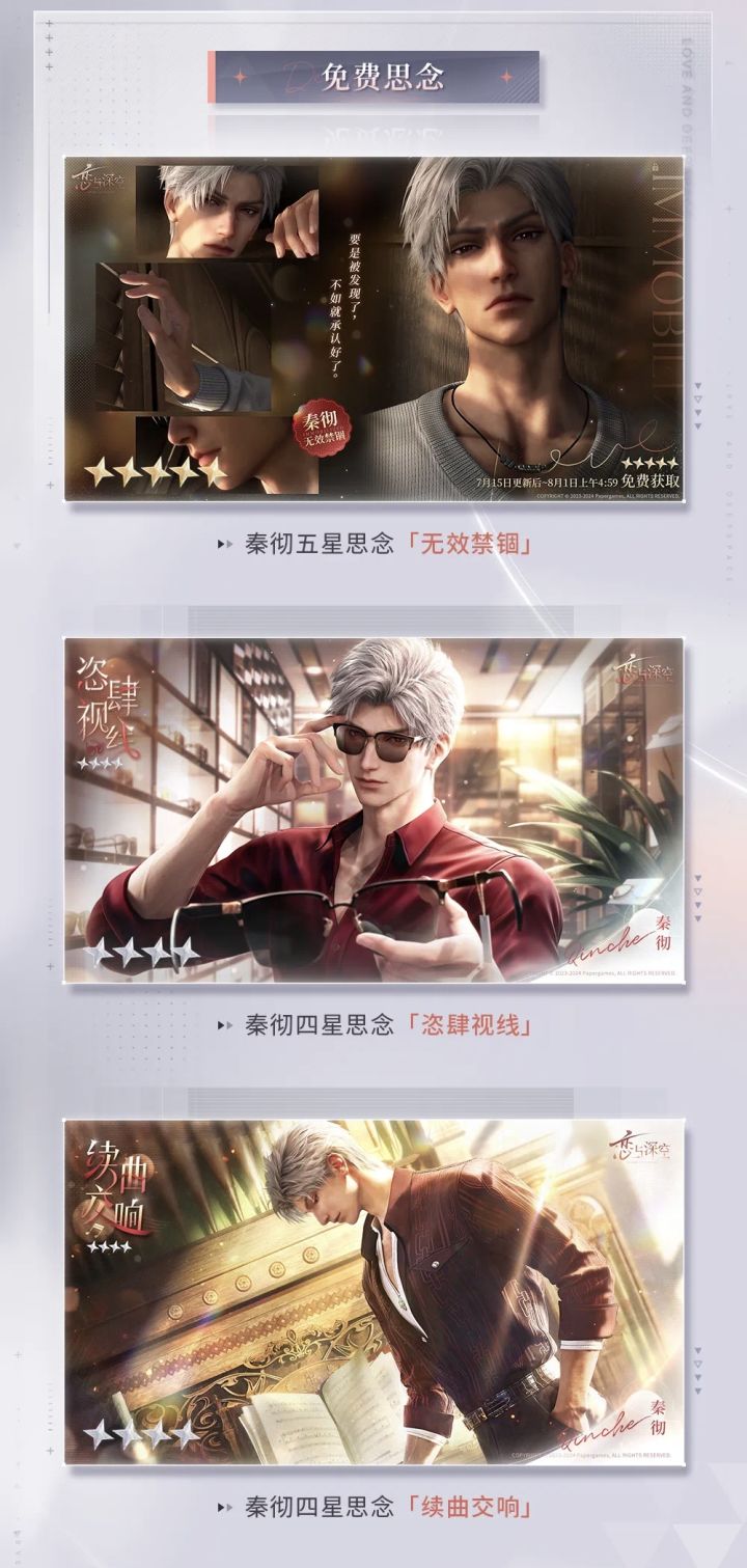 3⃣️免费思念:秦彻五🌟思念1⃣️张➕四🌟思念2⃣️张(更新后新活动获取)