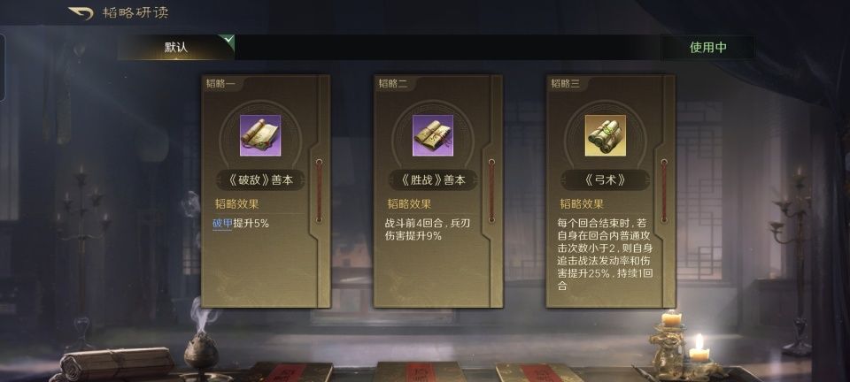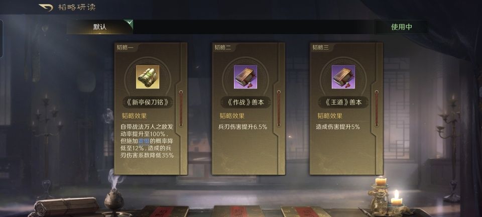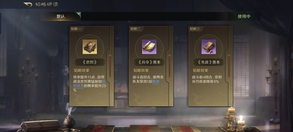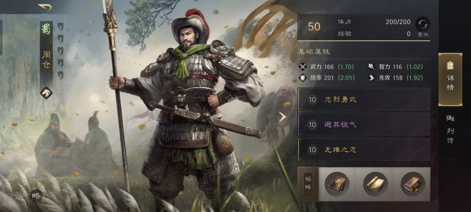 既然队伍里有周仓镇场子,毫无疑问肯定是摆箕形阵了。在第二和第三战法的搭配上,选择了避其锐气和无难之志,张飞和黄忠都将提升45%的连击和20%的倒戈。韬略库里一金两紫,忠烈、兵令善本和先战善本,令周仓的抵御和掩护效果更佳。
