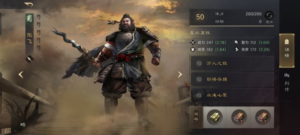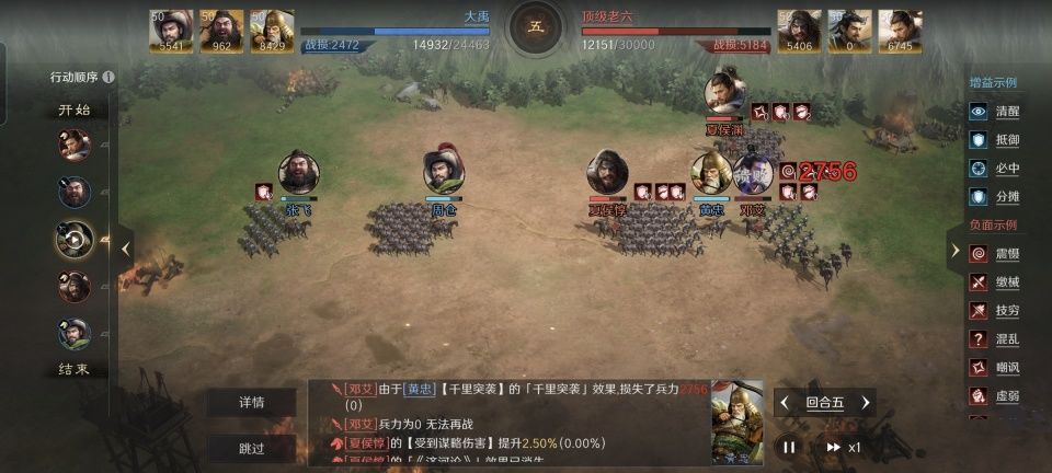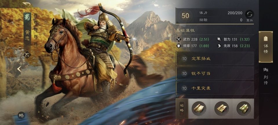 最没有搭配悬念的黄忠,自然是放在最后一个登场,甚至可以一笔带过。锐不可当和千里奔袭是常规操作,小金书肯定带弓术,还要带上破甲的小紫书,这就算是齐活儿了!值得注意的小细节是,邓艾的先攻相对于夏侯惇和夏侯渊也是最低的。如此一来,这支队伍里的张飞和黄忠特有默契的把火力优先覆盖到了邓艾的身上。