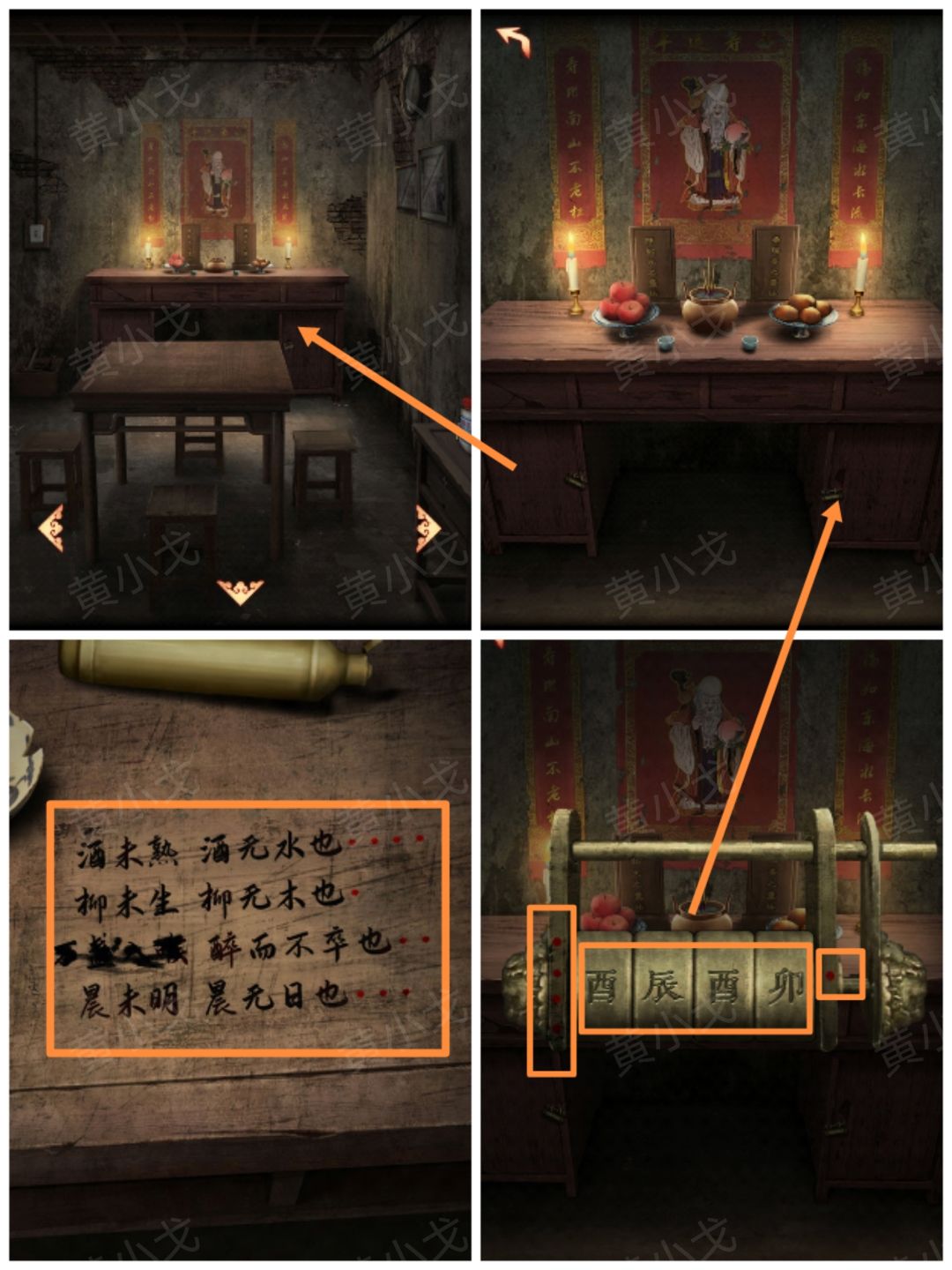 1.(堂屋-中)点击供桌右侧柜门上的锁,根据上面的提示(四个点、一个点),结合厨房桌子上的线索,输入密码:酉辰酉卯(四个点-酒未熟,酒无水也-酉、