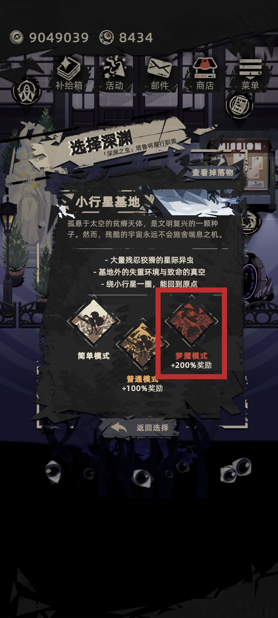 地图选择小行星基地选择梦魇模式boss不容易被打死。