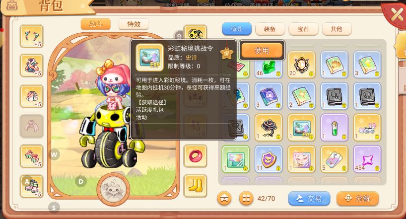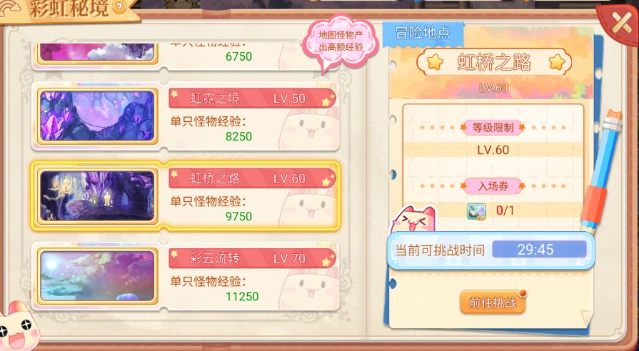 每张彩虹秘境挑战令,可以使用30分钟,期间可以不断的在彩虹秘境中刷怪获取经验,并且其中的怪物刷起来也相对较简单。中途玩家可以退出彩虹秘境,并且挑战时间会暂停,直到下次进入时才会继续流逝。