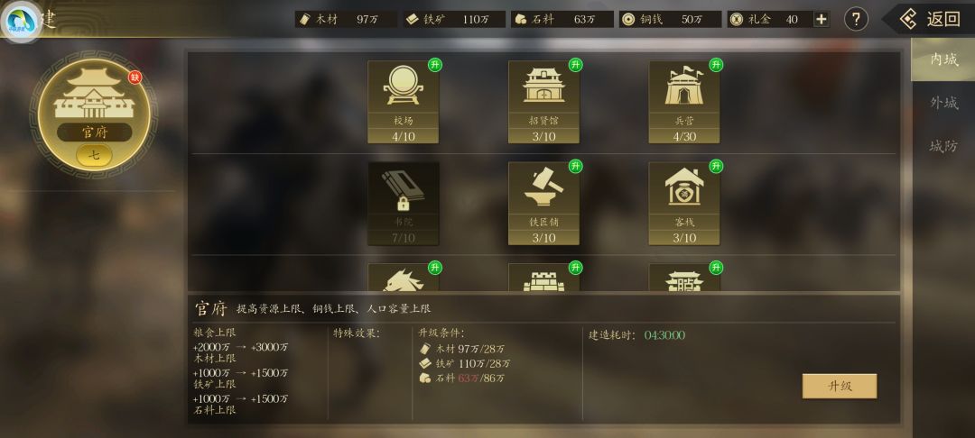 第三、升级自己的城池,现在一赛季已经开启城池筑城功能,建造一座永久属于自己的高级城,可以一劳永逸,既可以自由迁城,又可以正常免战,还不会被赛季回收。自建高级城需要将城内建筑全部升到满级,这个有些难度,我们需要找一个内政高的武将做主薄,可以提升建筑升级速度。