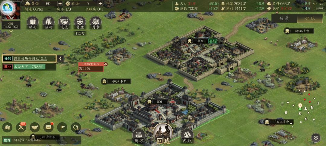 第一、主城校场1-10级阶段,这一阶段属于新手阶段,也比较简单,可以说分分钟就能达标。所用资源出门随便掠夺几个黄巾城或者汉灵帝城就够用。