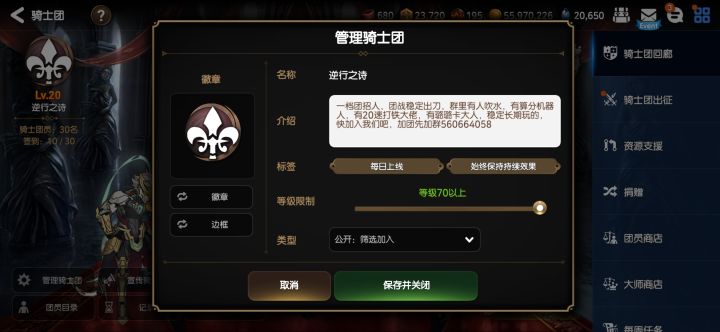 国服前百骑士团招人,稳定一档团,每周任务都拿满奖励,君羊里有算分机器人,大家都很活跃,氛围良好,时不时还有红包,君羊在图里,加团先加君羊,来会打团战的,长期玩的,进来了解看看