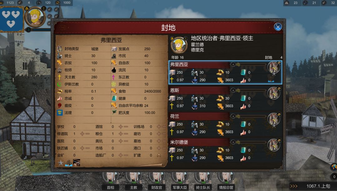 宗教 宗教人口只统计市民 自由农 农奴 流民 ,骑士和牧师默认视为与领主相同信仰,鼠标移到每个人口上会具体显示不同宗教的人口
