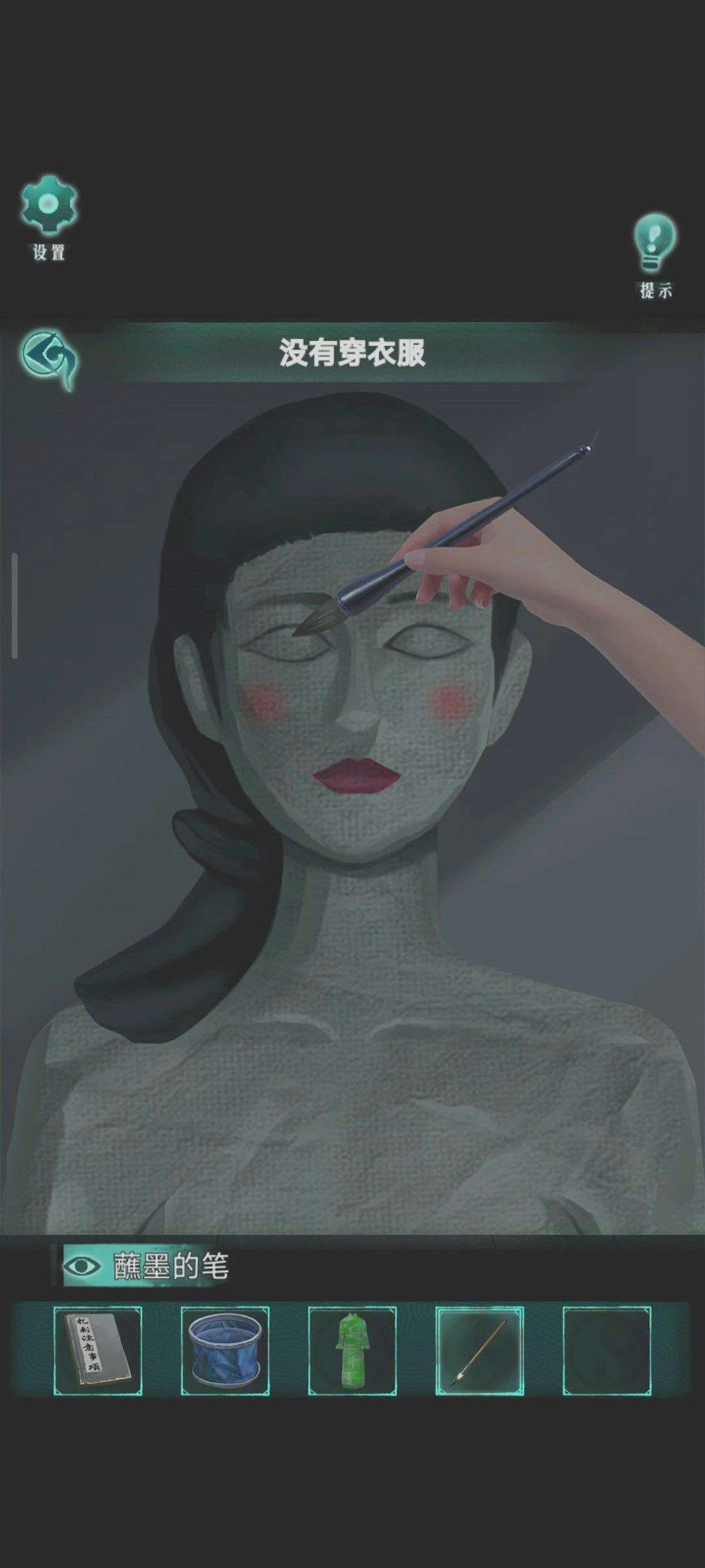 将炭火交给女人,作为回报,你得到了一个砚台。在柜子上输入081828,你将获得一把刷子。用水桶取水,得到绿色的颜料。将纸裙染成绿色,来到放棺材的地方,为女人点上眼睛,第一关的挑战就此结束。