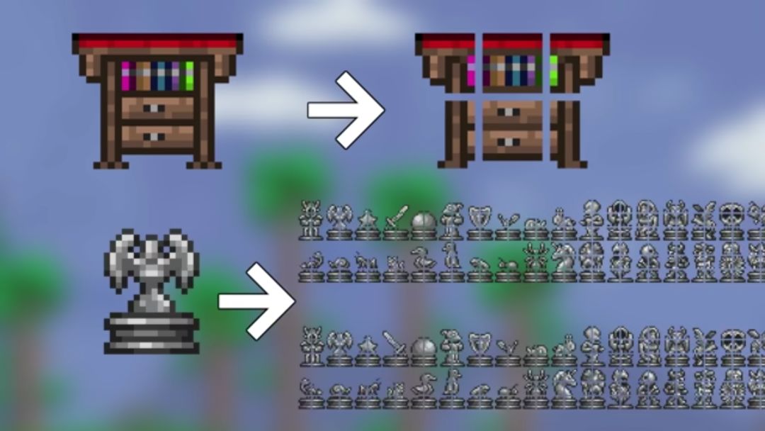泰拉瑞亚的物品贴图都储存在电子表(sprite sheet)上。frameX与frameY是以像素(px.)为单位的用于定位某个物块贴图在电子表中的位置的值(可以将电子表理解为中学所学的直角坐标系,但它其实更像早期的元素周期表),整个坐标系以左上角为原点,frameX值向右增长,frameY值向下增长。每当物块需要改变贴图时,系统都会为这个物块加减frame值,从而根据新的坐标取用新的贴图