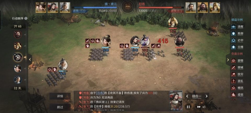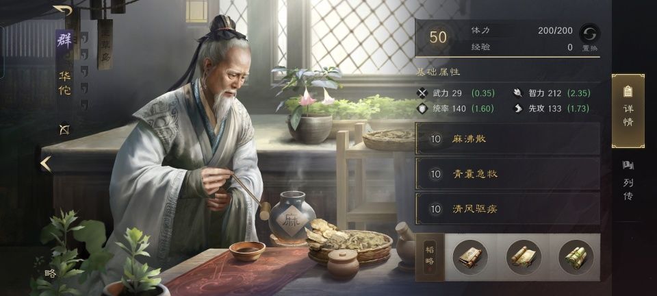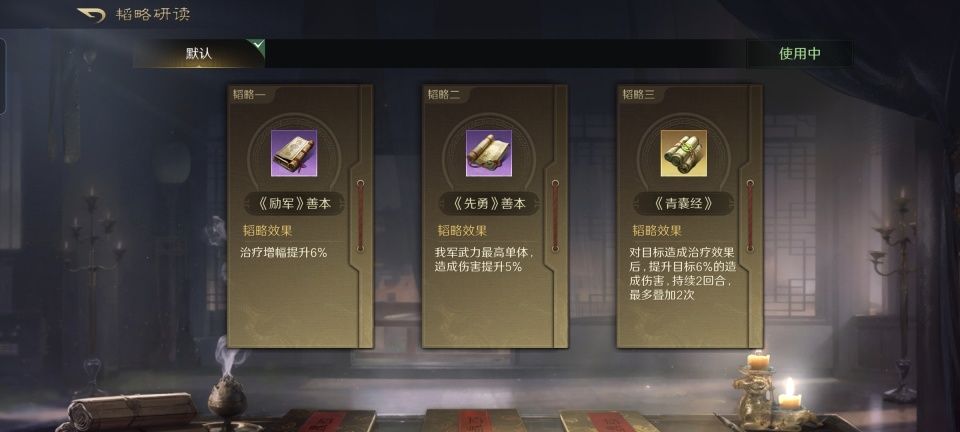 估计是担心貂蝉一个人在前面顶着张飞和黄忠,存在闪失的风险,华佗的所有技能都留给了医疗战法。麻沸散之后,跟进了青囊急救和清风驱疾,有效抵消掉了张飞施加的负面效果。三本韬略依次研读励军善本、先勇善本和青囊经,提升治疗增幅的同时更是给吕布也做了啦啦队。