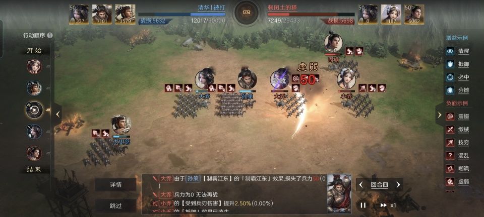 清华丨被打在这场战斗中摆出的是箕形阵,丝毫不讲究什么怜香惜玉,为了让孙策和太史慈在后排获得12%的伤害值提升,就这么堂而皇之把妹子给丢到前排火坑里了。大乔的战法配置方面,紧跟了以静制动和无难之志,可谓是一心一意做起了挡箭牌。孙策和太史慈还因为她额外提升了45%的连击和20%的倒戈,对于他们的输出和自保而言都助益良多。