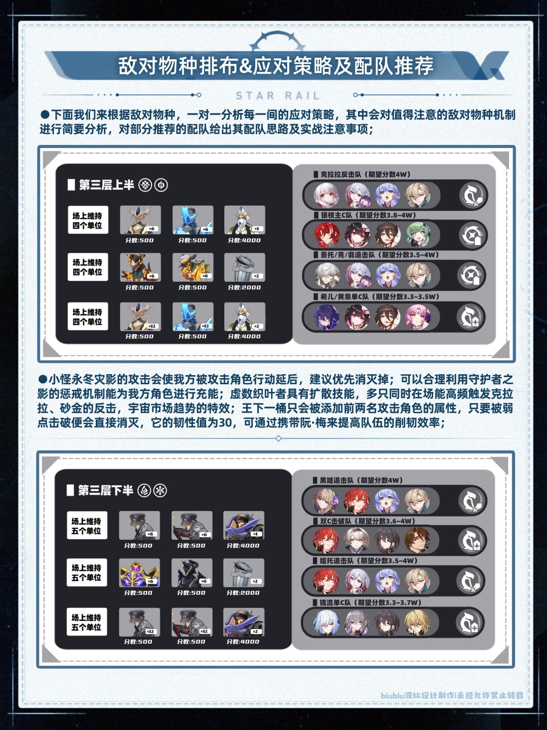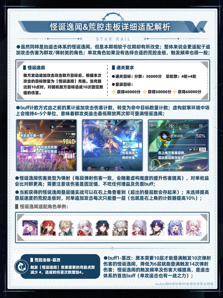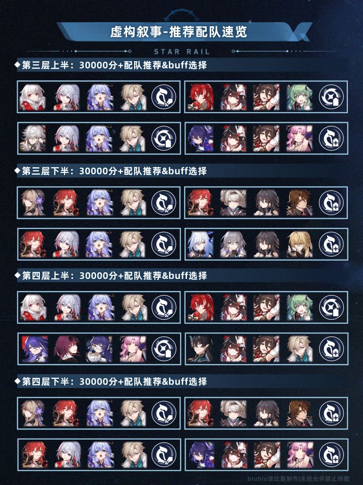 本期虚构叙事从综合层面考量难度适中,选择合适配队很容易就能拿满奖励;怪诞逸闻及荒腔走板对主打追加攻击且攻击类型为群攻的角色帮助巨大,在配队时可进行优先考虑;其实说白了就是为了立好翡翠的一期虚构(零星魂的翡翠甚至能打出0t的好成绩);但本期黑姬追击队依旧强势,克拉拉虽然因环境会受到一定影响但仍然能喝到汤;