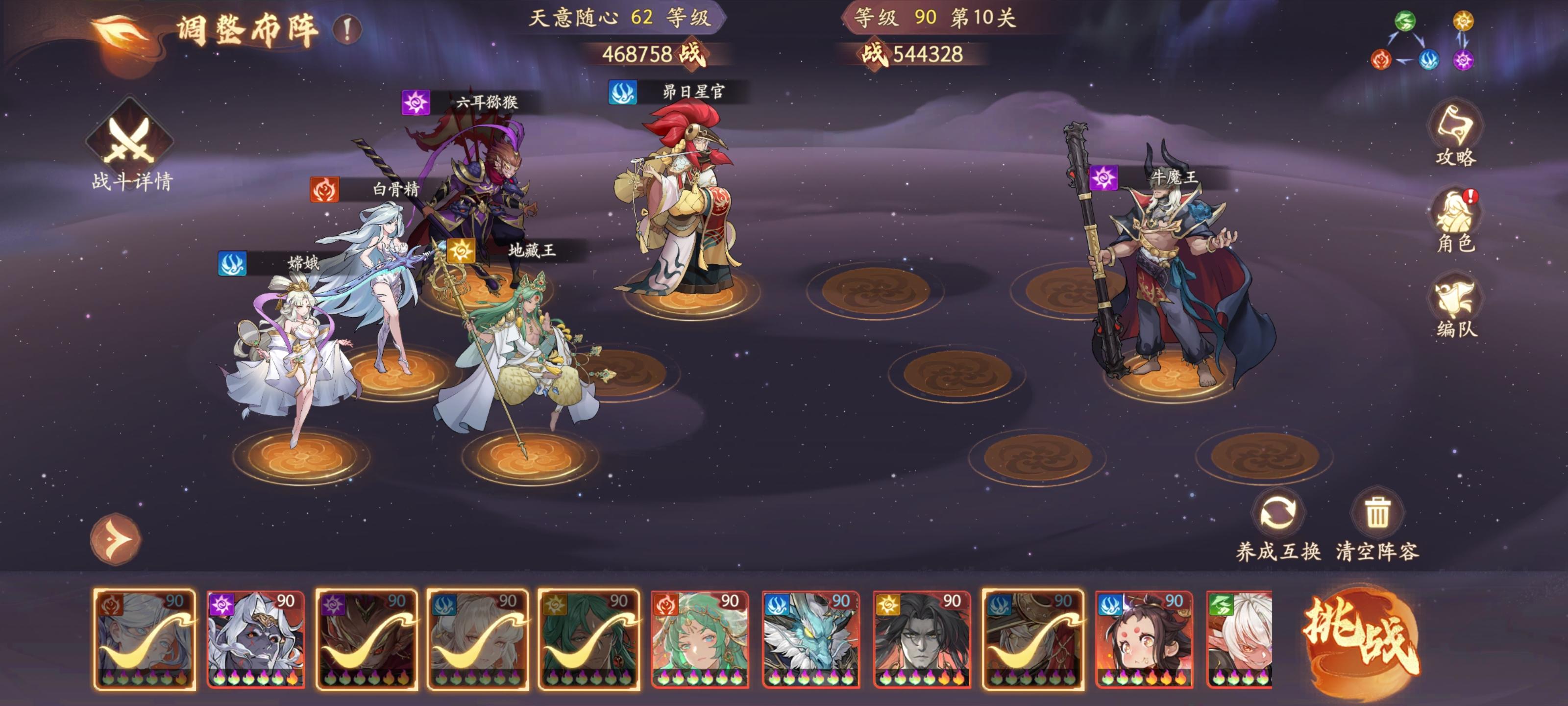 技能顺序,地藏3破甲,嫦娥3加攻,白骨2清小兵,黑猴3加追击带走一阶段。2阶段牛魔大招昂日和黑猴反击磨血,破盾后白骨3加追击带走。