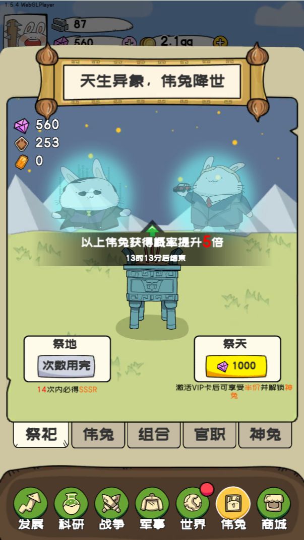 游戏中最为珍贵的货币--钻石,钻石可以帮助每个小伙伴进行伟兔抽取,前期钻石获取的渠道主要是通过战争胜利和每日任务,小伙伴们记得合理分配钻石资源哦,尽量通过抽取不同类型的伟兔来丰富自己的增益buff,希望小伙伴们十连全金~~