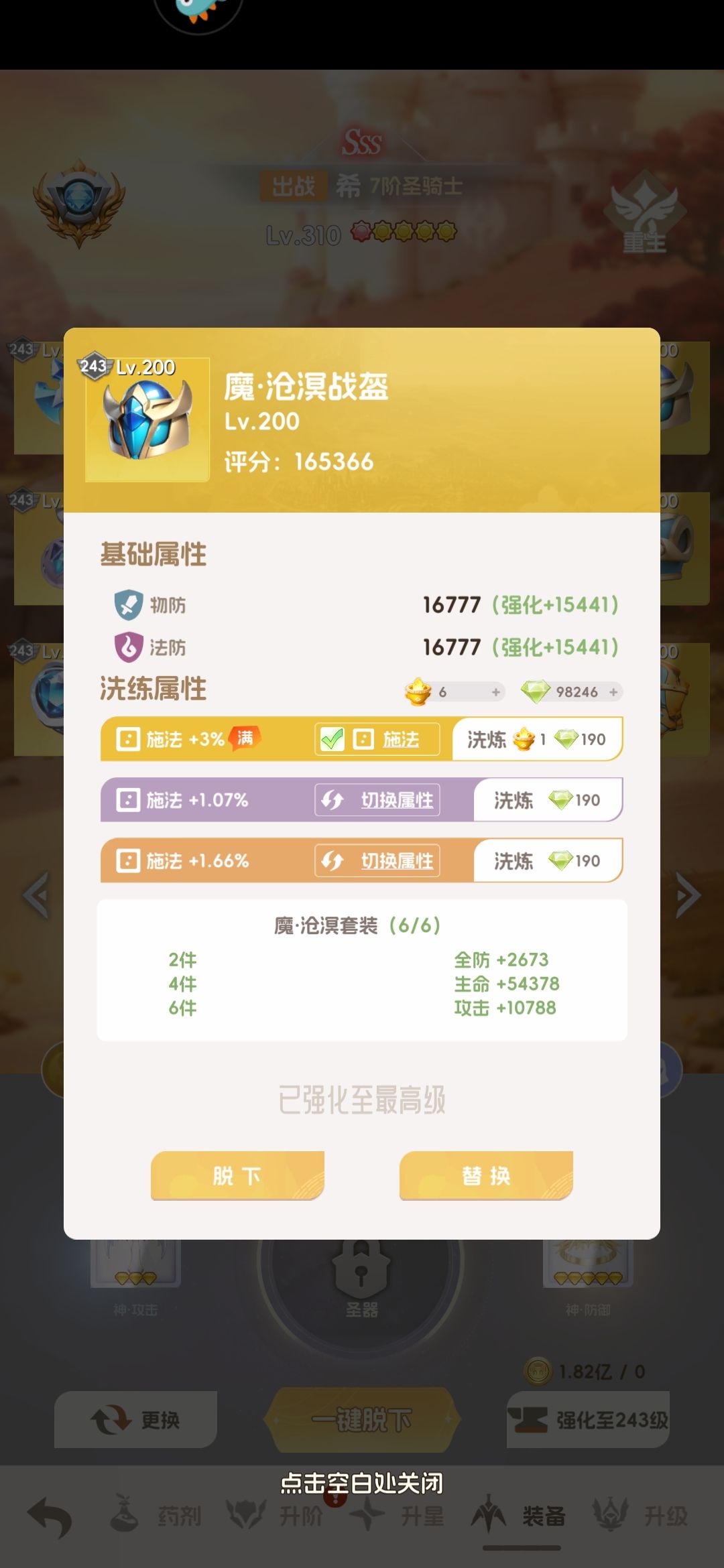 继续给大家科普了,这游戏每个英雄选好后有个问题,施法率,这玩意初始60%,目前唯一办法是在红色装备上,一个可以洗3条,所以0氪的最好是攒魂晶,然后在装备小按钮这选自选(非常隐蔽),选择施法,80-90%几率就很爽了,每回合放大招(这游戏没有怒气值概念哦),到300级及之后装备,施法洗到85就够了,因为会有个圣器加10+%。多余属性过图就洗攻击,PVP就洗速度。