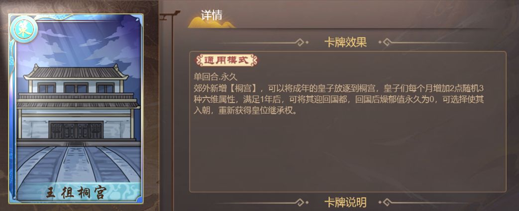 作为一张实用的功能性策卡,可以将皇子流放至桐宫,从而永久清空皇子的躁郁值。后续就算不立为储君,也可以有效避免内外封之后的皇子造反事件,附带的六维属性增长也可以有效提升成年皇子的能力,相对来说还是很有作用的。