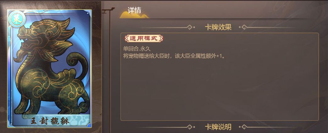 作为一张半填坑的卡牌,大大提高了宠物系统的实用性。宠物不再只是单单的一个摆设,实用性大大提高。除此之外,还可以通过多次赏赐宠物来提高臣子的属性,可算是对新手友好的一张提高臣子属性的卡牌。