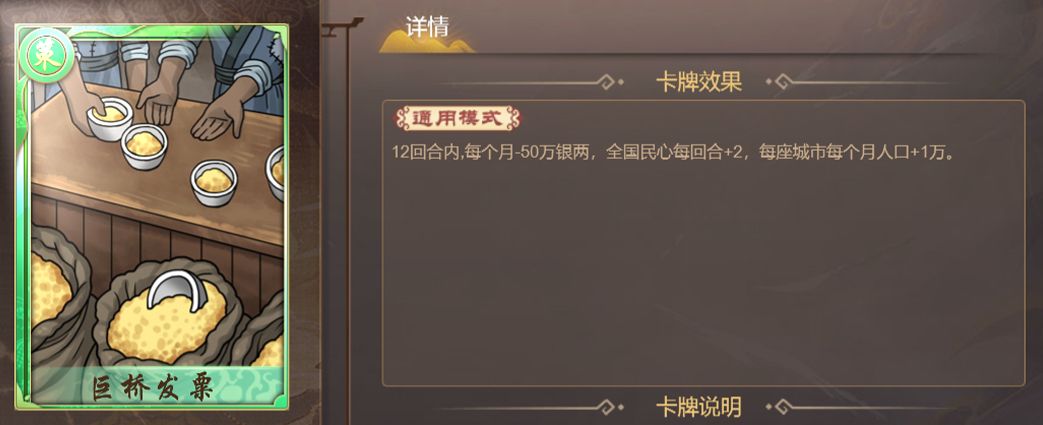 强力的民心提升和人口提升buff,无疑是为开局初期步入正轨加快了步伐,唯一美中不足的是每回合扣除50W银两,但在白卡里面依旧是强力的存在。