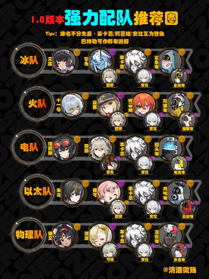 由于角色较少,绝区零的最优配队基本是定死的,因此根据一图流选择较为完整的配队即可。