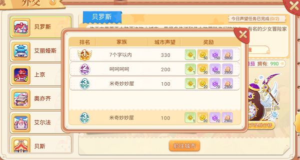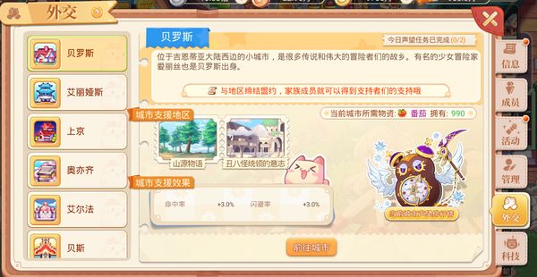 每个城市会有专属的外交大臣,向外交大臣提供城市所需物资即可获取对应城市的“声望”和“外交币”