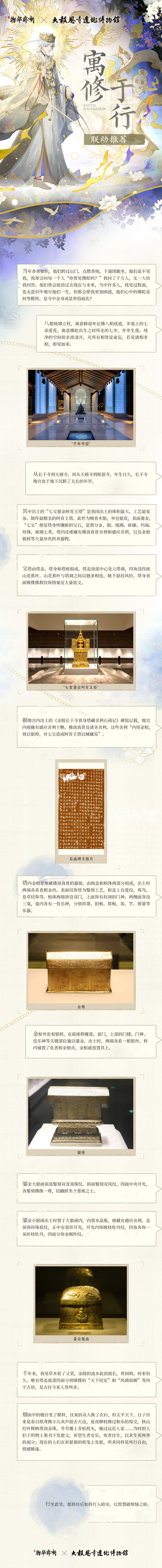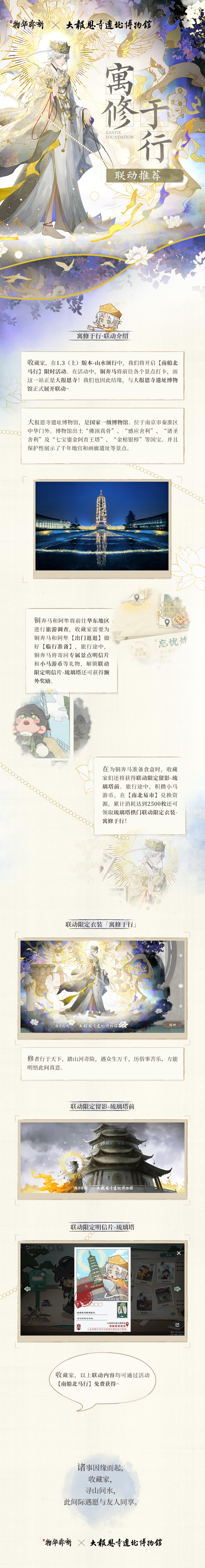 在1.3(上)版本-山水颂行中,我们将开启【南船北马行】限时活动。在活动中,铜奔马将前往各个景点打卡,其中一站正是大报恩寺,我们也因此结缘,与大报恩寺遗址博物馆展开联动~收藏家们还可通过活动免费获得琉璃塔拱门联动限定衣装「寓修于行」、联动限定留影-琉璃塔前和联动限定明信片-琉璃塔!