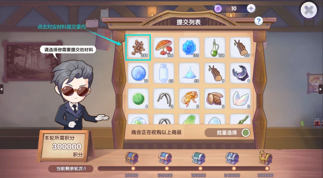 开启商团委托后,只需要点击你想要提交的绑定材料,即可完成。积分达到上限后,完成该轮次的商会委托,并能获得对应你当前等级的Base、Job经验以及可以在商团商店兑换道具和用于扭蛋机的商团纪念币。