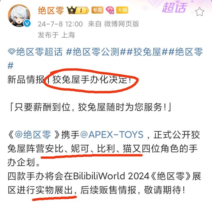 官方将携手APEX-TOYS ,正式公开狡兔屋阵营安比、妮可、比利、猫又四位角色的手办企划